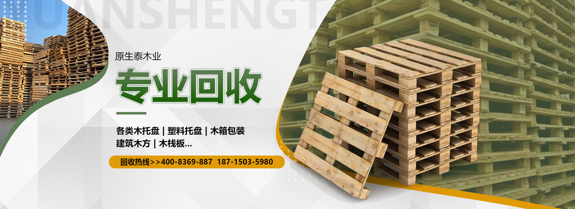 原生泰木業有限公司是一家服務各市的企業,本公司是以回收各類二手廢舊木材為主,主要回收各類木托盤、塑料托盤、木箱包裝、建筑木方木板、木棧板等等。本公司收購價格以托盤、木箱木材的規格、使用情形、新舊程度、材質為估價標準,如果您有意向出售您的閑置木制品以及塑料制品,請您聯系我們時告知其數量、尺寸、型式、使用情形,我們免費為您提供電話估價或到現場報價。本公司是一家經工商局嚴格注冊的正規木制品回收公司,回收木托盤、木箱包裝致力于環保建設、綠色合作以求雙贏。同時原生泰木業公司也對各地范圍出售二手木托盤、二手塑料托盤、各種二手木制品。及時送貨上門,價格公道。公司下轄木材加工廠,組裝廠,并備有大型標準烘房,多功能平板刨,壓刨,挖槽,機械設備等。產品主要生產各類木托盤、木包裝箱銷往國內大中型城市并隨貨通行出口國外。本公司將以豐富的知識,提供合適的方案來服務和滿足每一用戶不同的需求,品質至上,誠實守信。